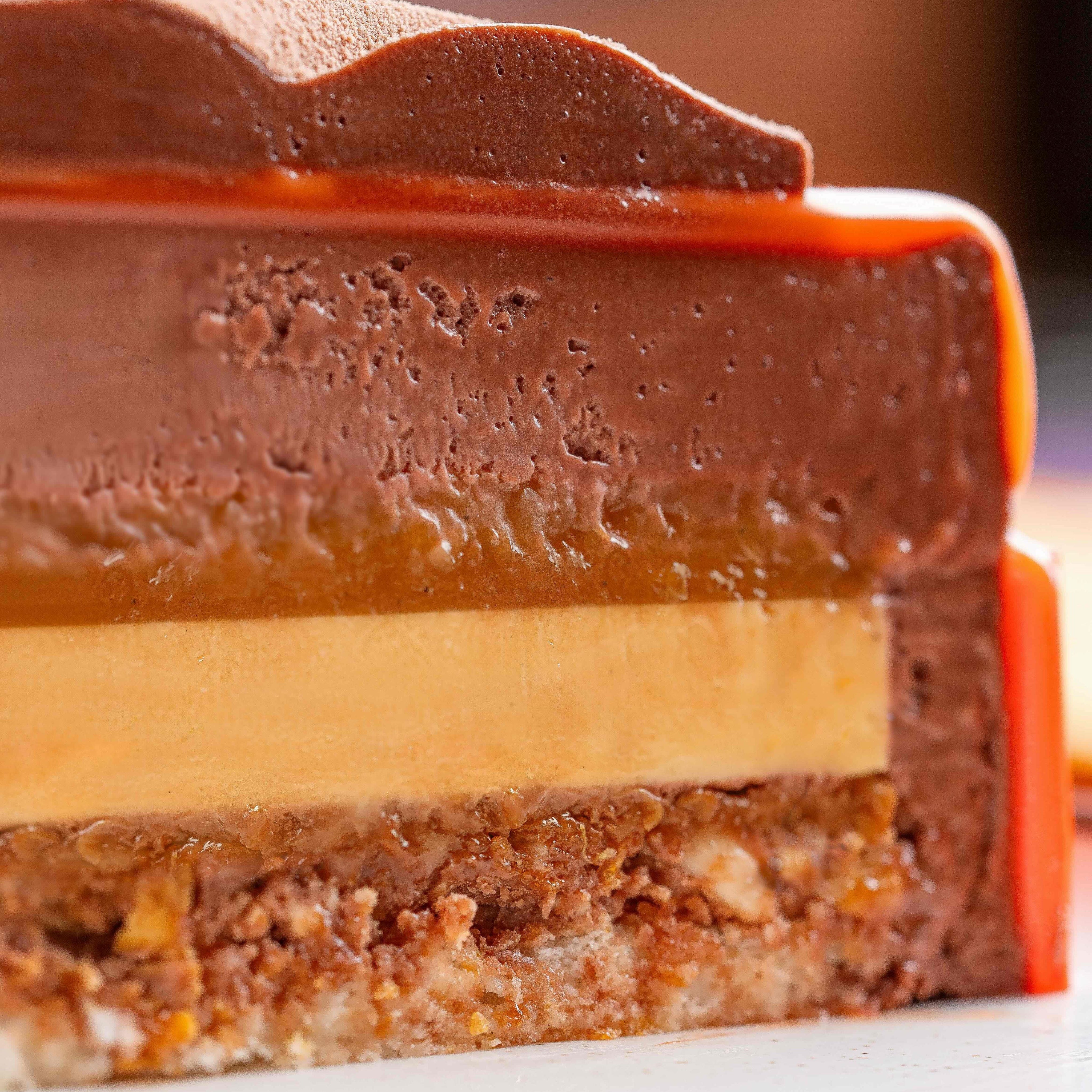 Hazelnut dacquoise | Praline crunch | Vanilla orange marmalade | Chocolate & praline mousse Contains nuts, dairy,...
