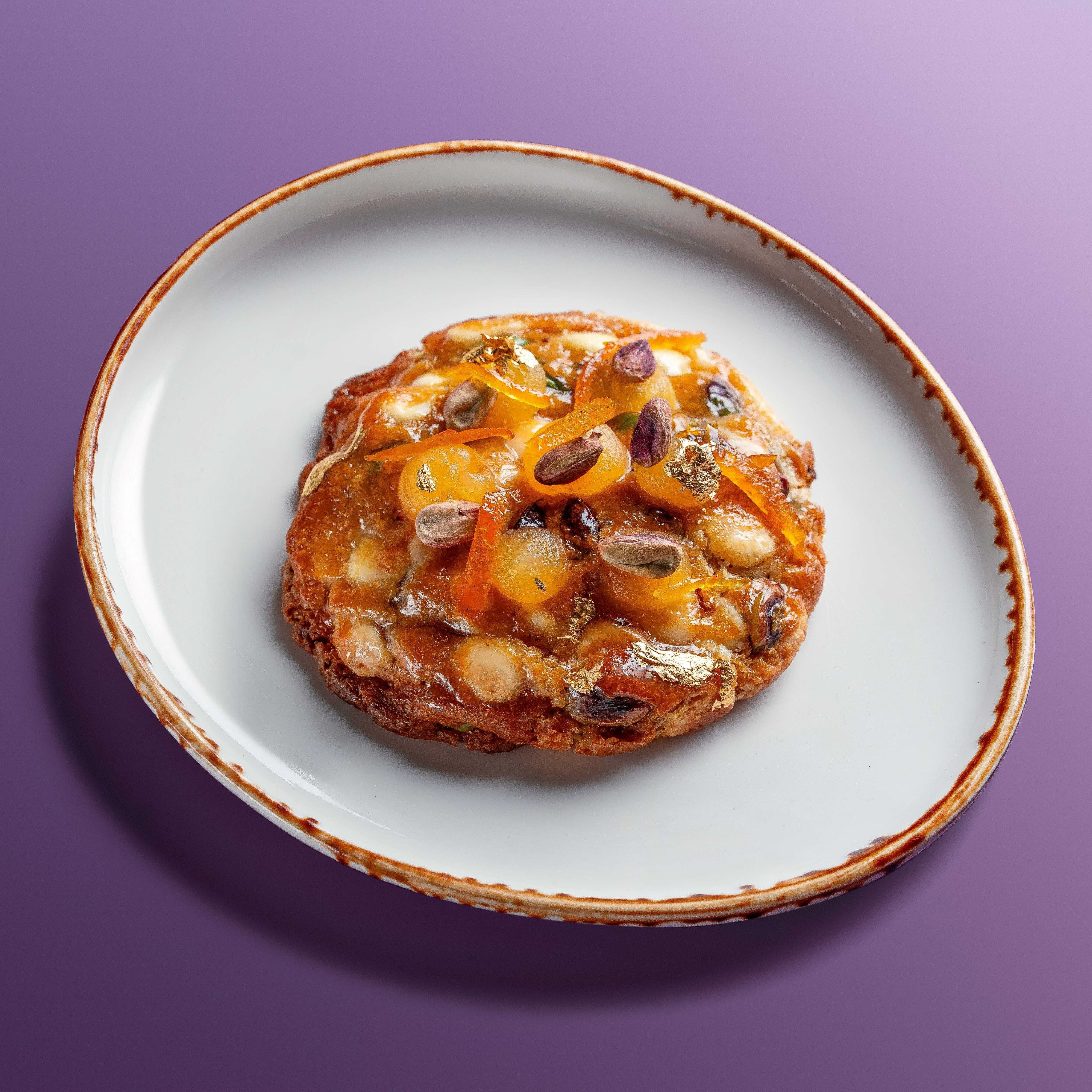 Chunky pistachio cookie | White Chocolate | Candied orange | Mandarin gel | Pistachio praline Contains nuts, gluten, ...