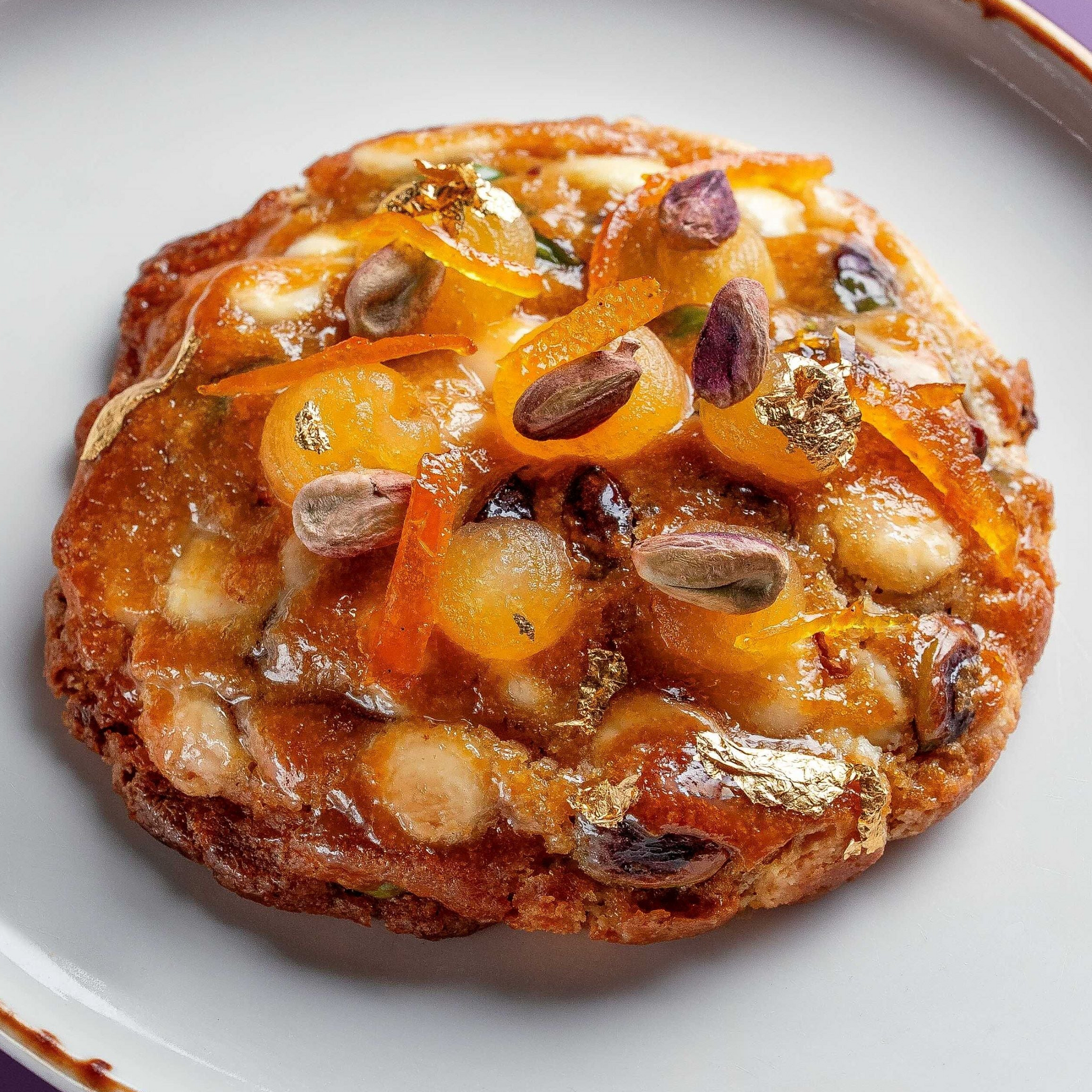 Chunky pistachio cookie | White Chocolate | Candied orange | Mandarin gel | Pistachio praline